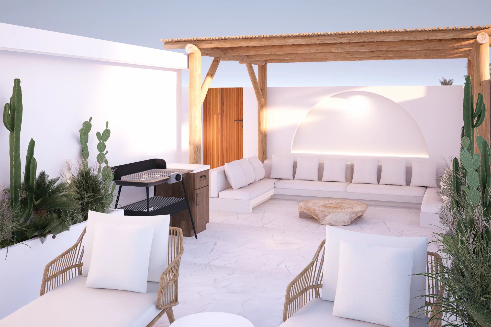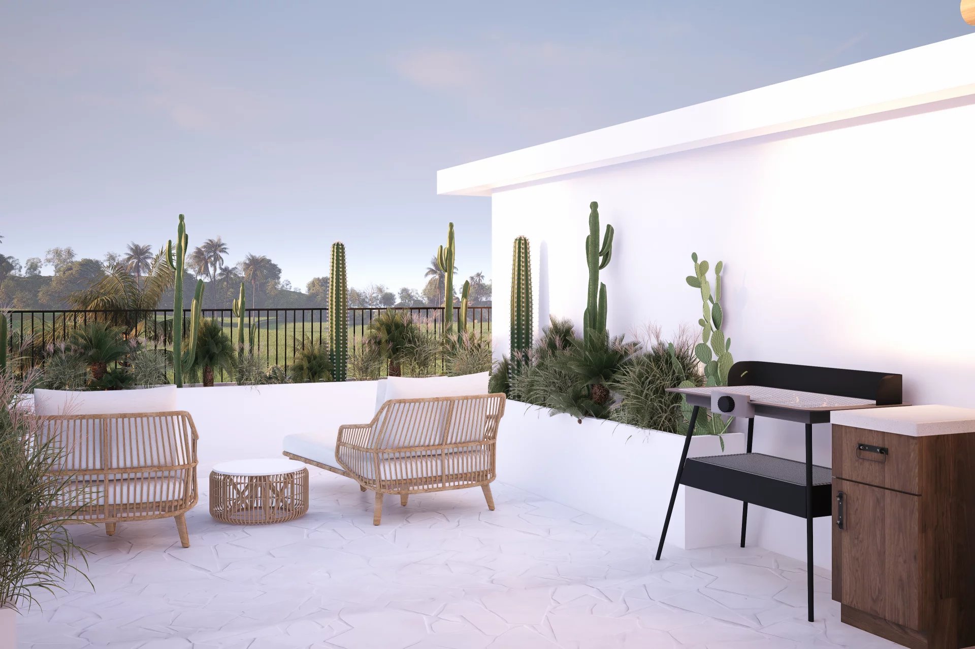 L’espace intérieur comprend deux chambres spacieuses avec salles de bains attenantes, une cuisine fermée élégante et un séjour lumineux. À l’extérieur, une piscine privée s’ouvre sur un environnement verdoyant, tandis qu’un rooftop offre un espace idéal pour se détendre et admirer le paysage.