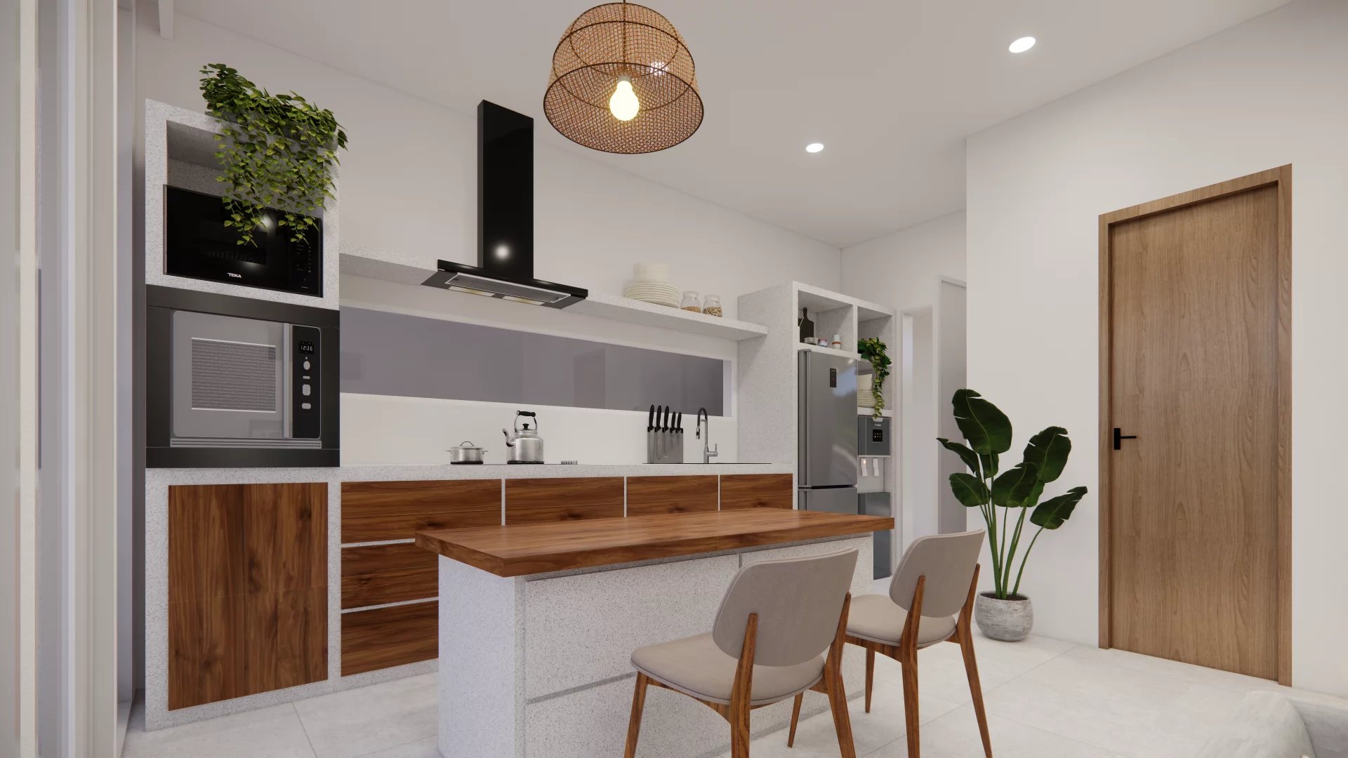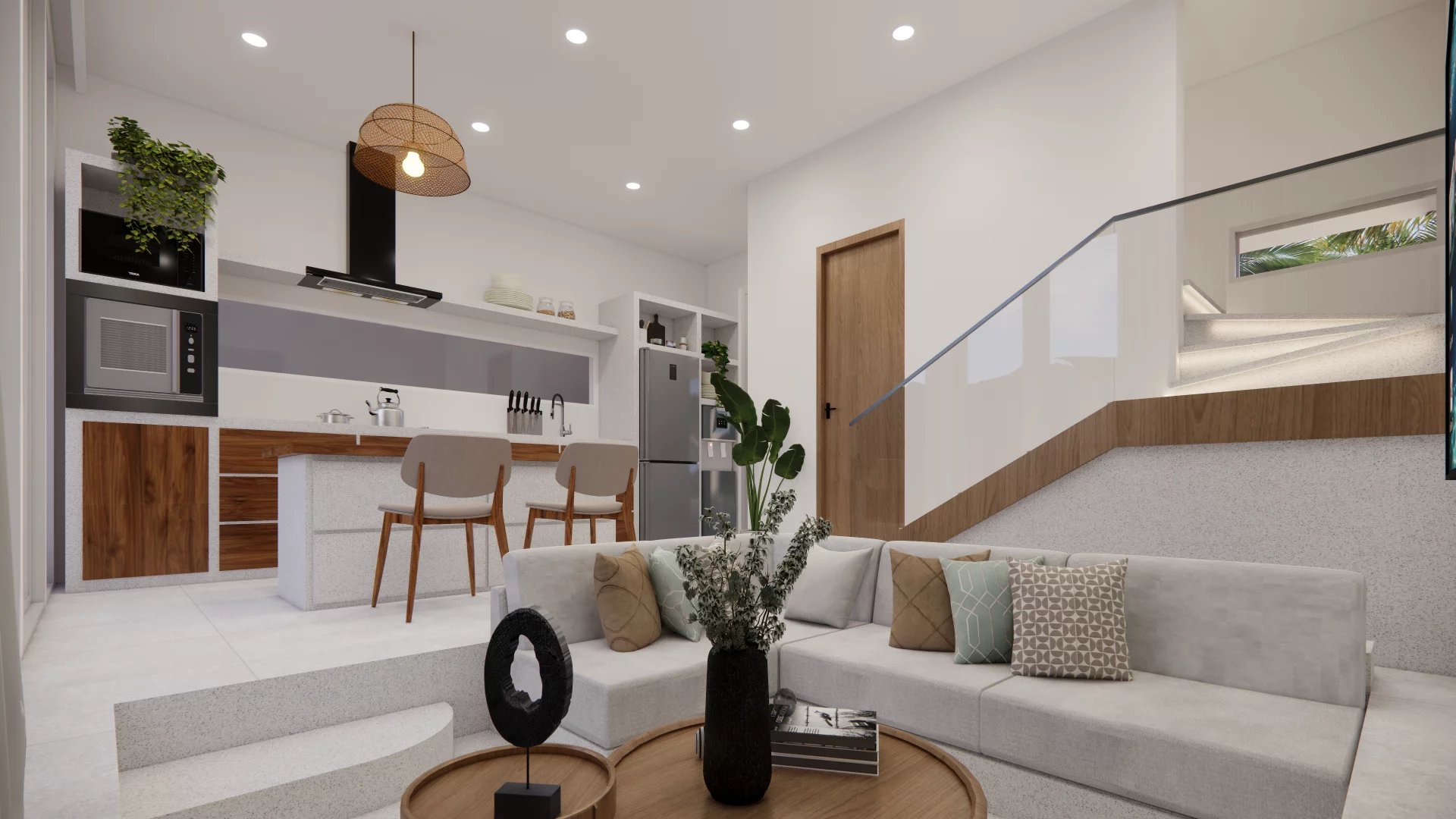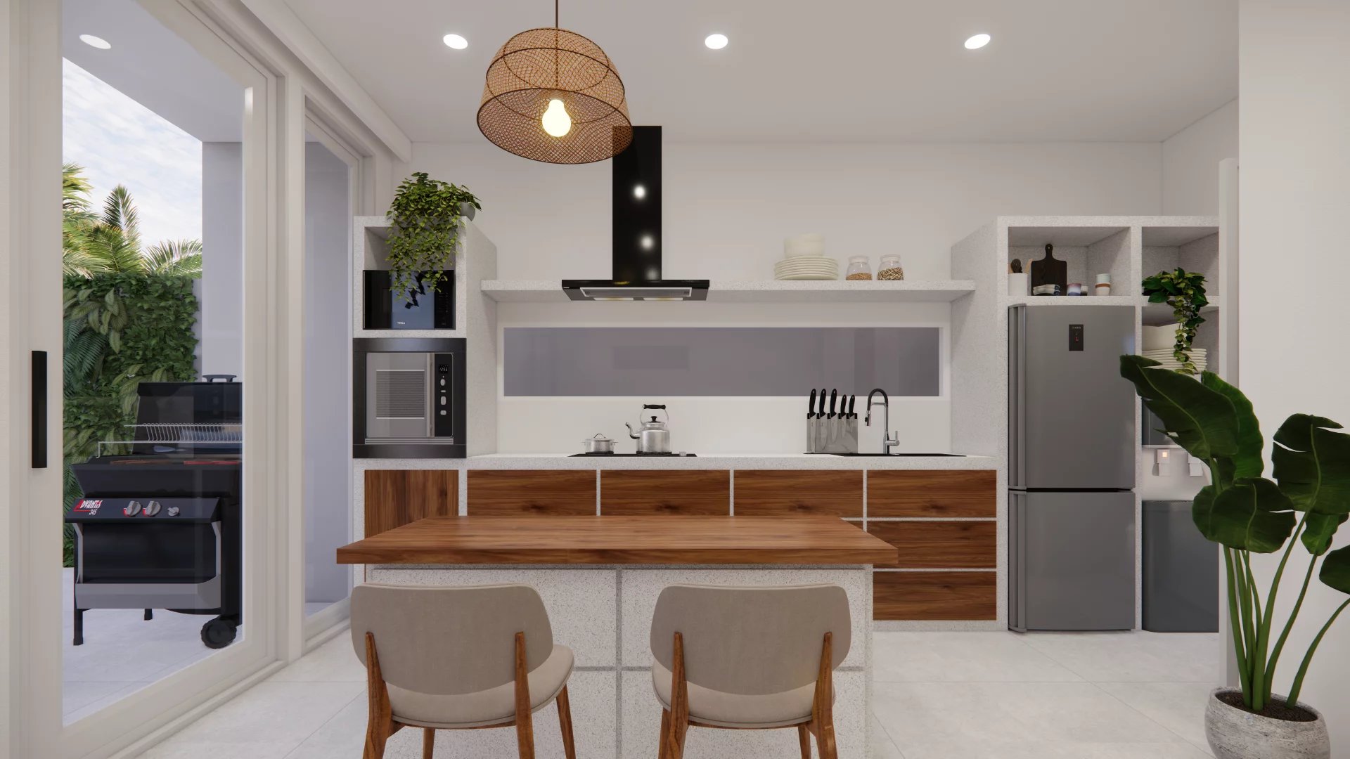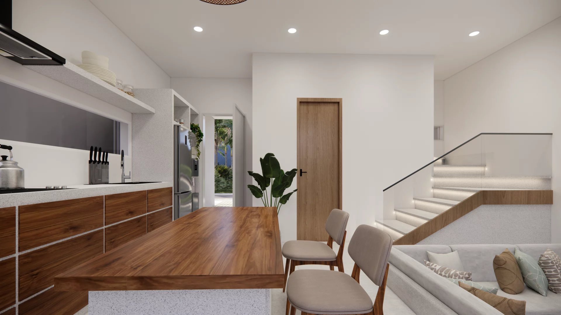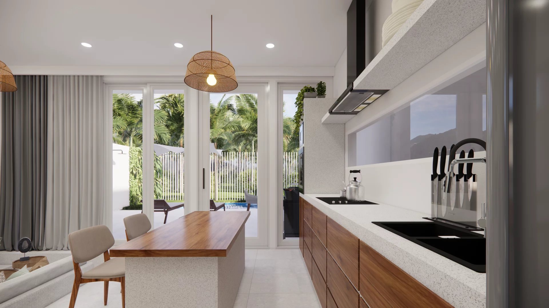 The villa’s modern architecture blends perfectly with the surrounding tropical landscape. Each room has been designed to offer maximum comfort and style. The open-plan kitchen is equipped with top-of-the-range materials, perfect for preparing delicious meals while enjoying the view of the garden.